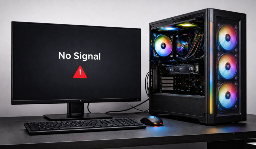 This step-by-step troubleshooting process is for a desktop PC that powers on but shows no video output, including blank screen, no signal, or no BIOS/POST display. It begins with basic hardware checks and advances to deeper diagnostics involving GPU, RAM, BIOS/CMOS resets, firmware compatibility, and potential motherboard or CPU issues methodically evaluating every potential cause.