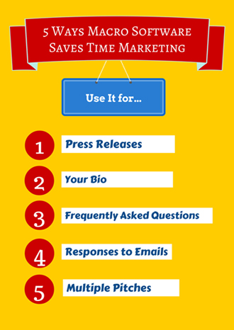 Joan Stewart uses Shortkeys, a keyboard macro utility for PC or Mac. She says it takes her less than 30 seconds to create a Shortkey and assign to it copy that she can use over and over again, by typing only a few keystrokes.