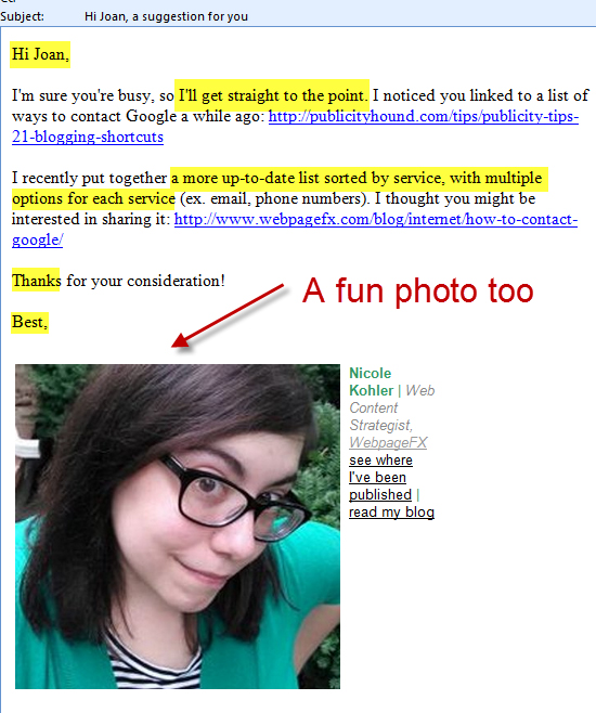 I would be completely remiss if I didn’t mention that I learned the “I’ll get straight to the point” opener from one of my team members here at WebpageFX. I’d never heard of or seen an email with that line prior to coming here, and when he mentioned it was his go-to, I thought “hmm, I’ll have to try that.”