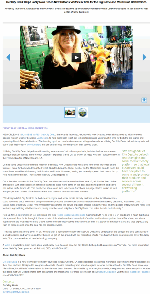 Here’s a fun video that Get City Dealz, a New Orleans business, embedded in its press release on BusinessWire two years go. The video illustrates how Get City Dealz is teaming up with a new boutique in the French Quarter to help them both reach out to tourists and visitors just in time for the 2013 Super Bowl and the upcoming Mardi Gras celebrations.