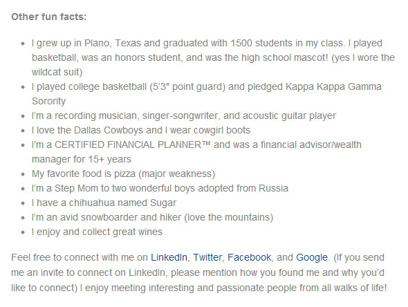 Stephanie helps financial advisors, business professionals and executives build their online influence. That’s the gist of her bio on her About page. She also included a separate section called “Other fun facts”: