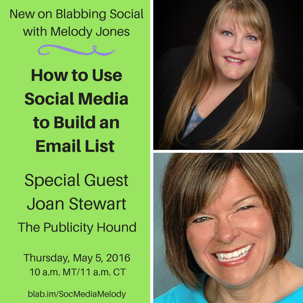 I’ll share more tips when I’m a guest on a Blab hosted by social media expert Melody Jones from noon to 1 p.m. Eastern Time on Thursday, May 5. It’s called “How to Use Social Media to Build an Email List.” If you’re familiar with Blab, you can register here. If not, keep reading.