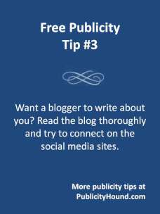 Free Publicity Tip 3: Want a blogger to write about you? Read the blog and connect on social media sitesTrying to get in front of influential bloggers and catching their attention isn’t always easy. This includes journalists who blog.