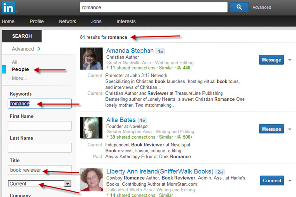 LinkedIn Advanced Search for book reviewers who review romance novels