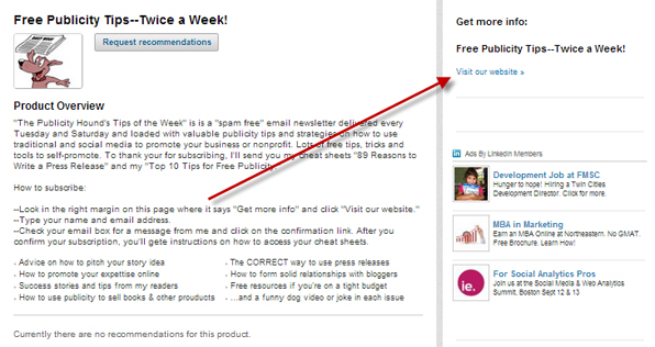 Thanks to Wayne, I now have the same opt-in box in two locations: one near the top of my profile page and the other on The Publicity Hound’s Company Page. And in little more than a week, I already have four people who have opted in, and I’ve hardly promoted it.