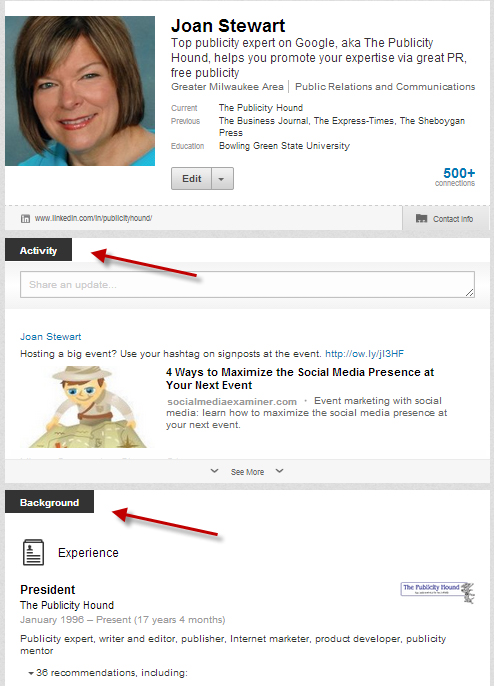 Before I heard Wayne’s idea for using LinkedIn to collect email addresses, visitors would arrive on my LinkedIn profile page and see my headline, then “Activity,” and then “Background,” with “Experience” at the top, like this: