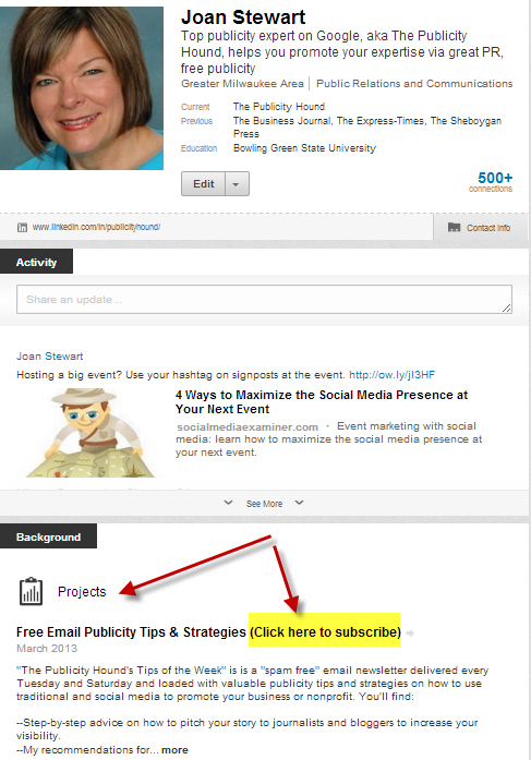 I never used the “Project” section on my Profile page. Now, I do. And I display it prominently, as the first category, right under “Background.” My ezine is, in fact, a project. And placing it high on the page tells visitors I have a newsletter and that they can subscribe.