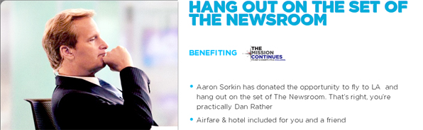 You can meet the cast and hang out on the set of “The Newsroom.” Producer Aaron Sorkin has donated the opportunity for you to fly to Los Angeles with a friend, including airfare and hotel, and watch the set come to life.