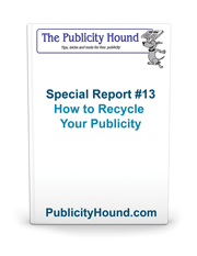 Now that social media and online publicity are critical components in a publicity campaign, we have opportunities galore to recycle publicity by taking one hit and turning it into 10 or 12 hits online and offline. Learn about them all in Special Report #13: How to Recycle Your Publicity (for Serious Publicity Hounds Only). It’s one of 52 special reports I’ve updated this year. Grab them all and save a whopping $518.